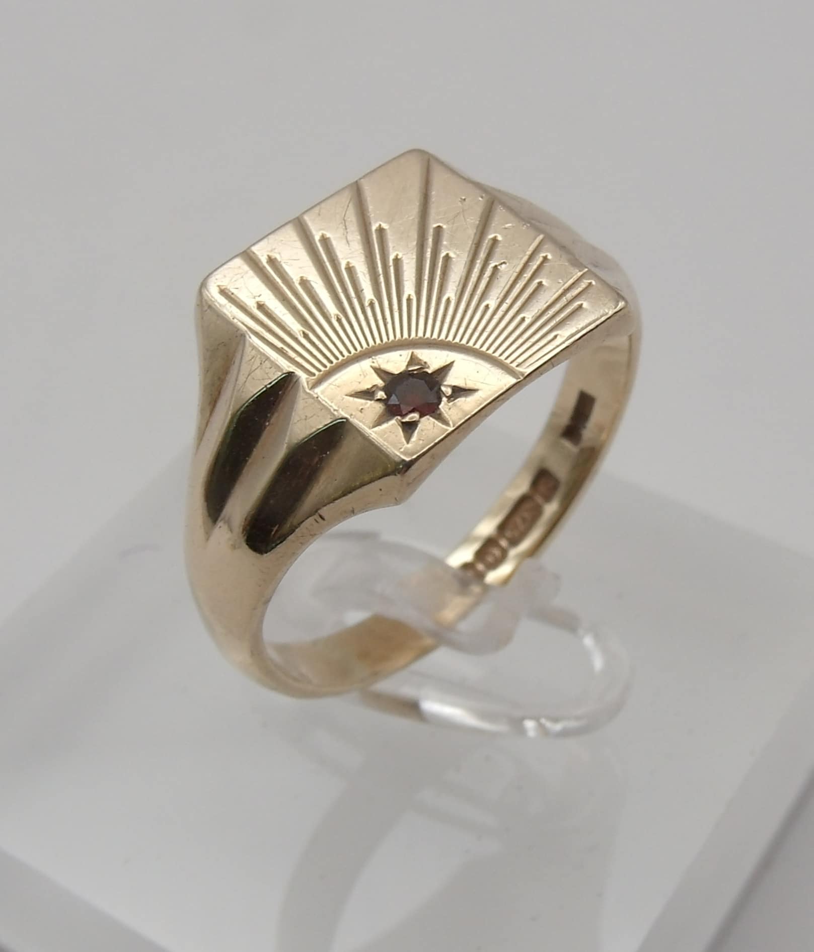 Vintage 9ct Yellow Gold & Ruby Sunburst Signet Ring Size U 5g