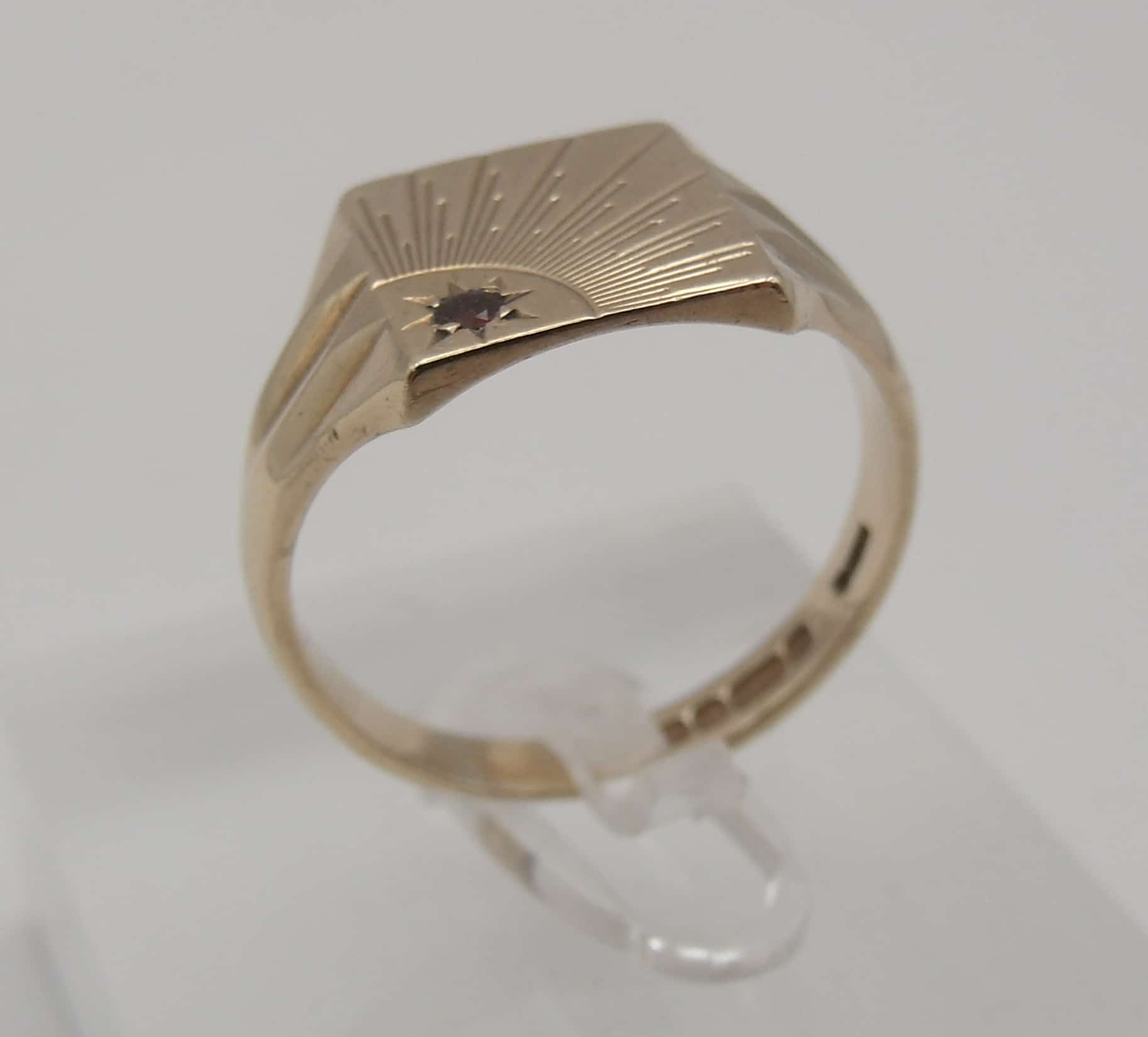 | A 9ct yellow gold signet ring with a sunburst design centred on a ruby. The ring is fully hallmarked for Birmingham 1994, weighs 5g and is size ‘U’. |