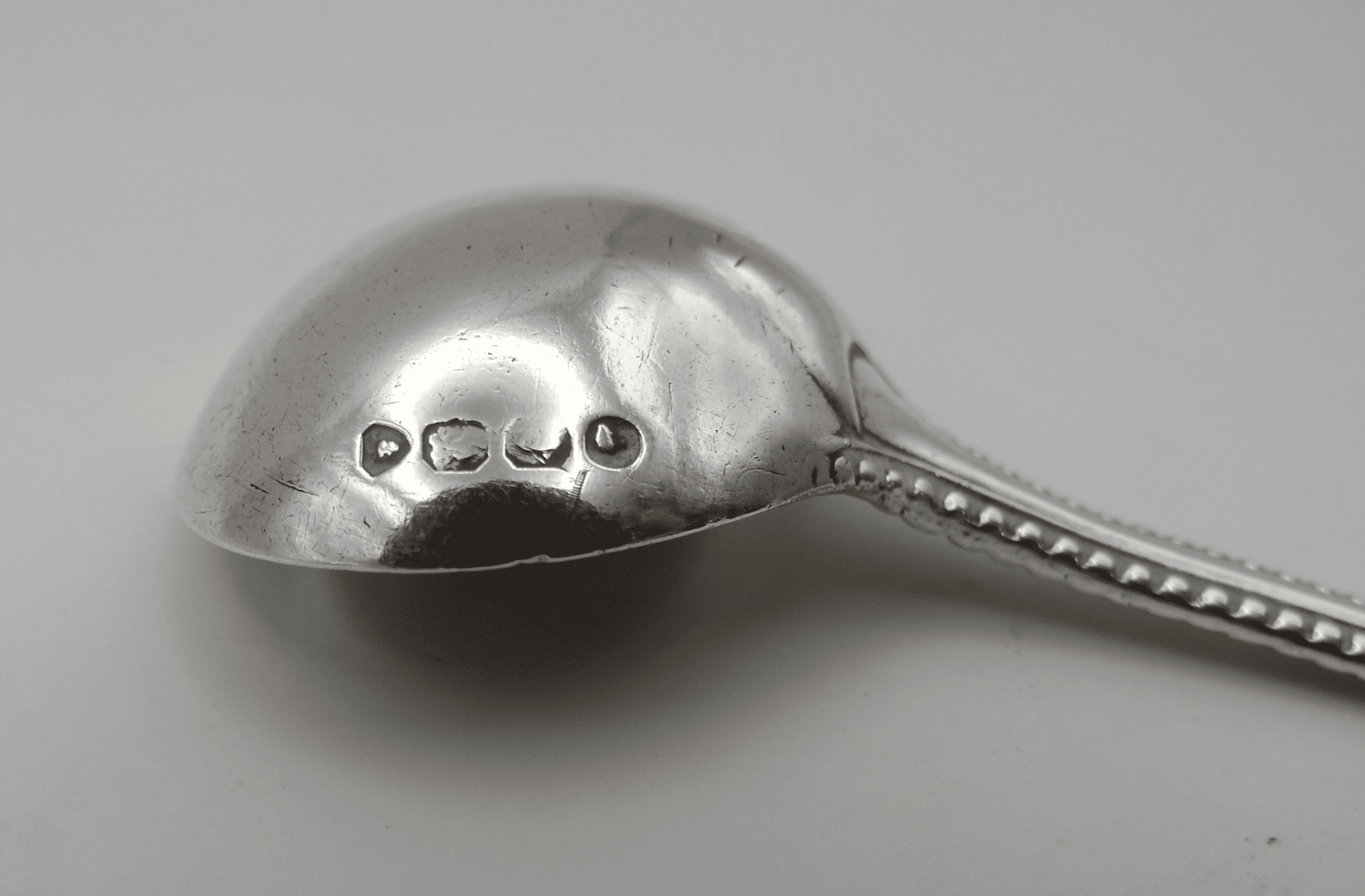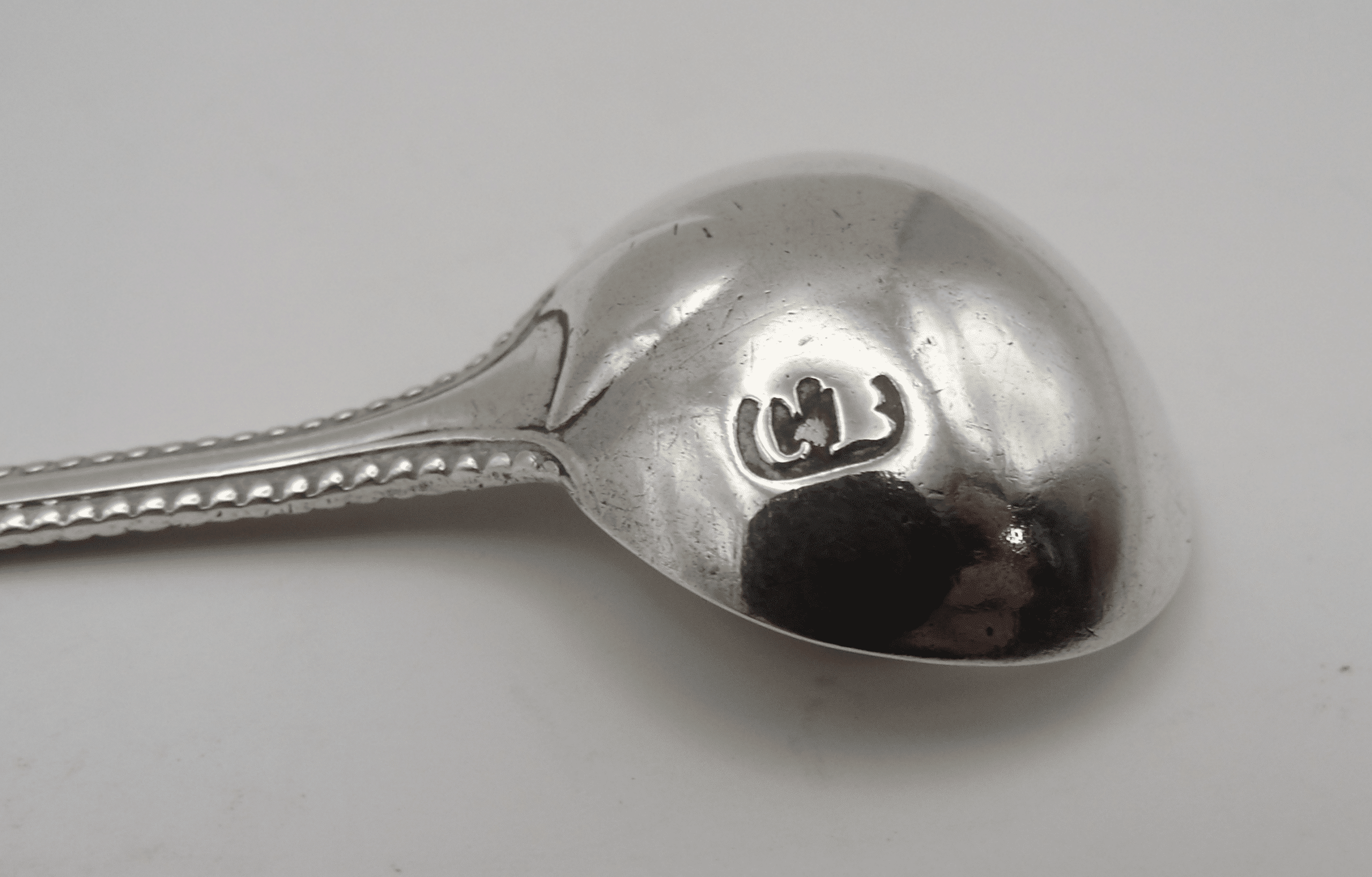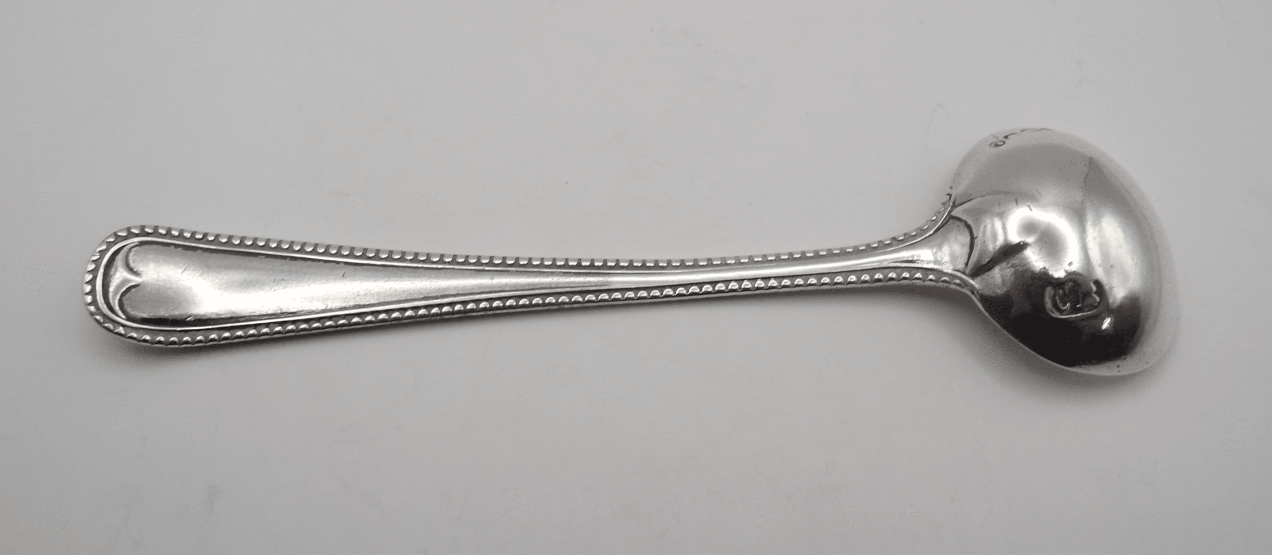 A Victorian Silver Mustard Spoon with beaded handle by Charles Boynton, London c.1850. The spoon weighs 16.4g and measures 11cm by 2.9cm. The hallmarks are rubbed but the makers mark (CB for Charles Boynton) is legible allowing the spoon to be roughly dated to the middle of the 19th century.