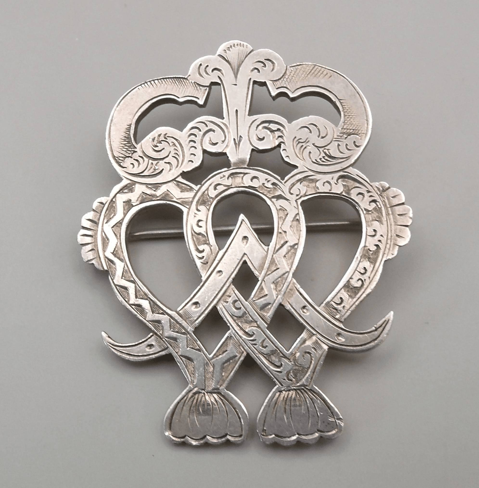 A Victorian Sterling Silver Luckenbooth Brooch in the form of intertwined hearts with engraved decoration, original tube hinge and c-catch with no evidence or repair or replacement. The brooch measures 50mm by 40mm, weighs 15.5g. and is hallmarked for Birmingham 1892.