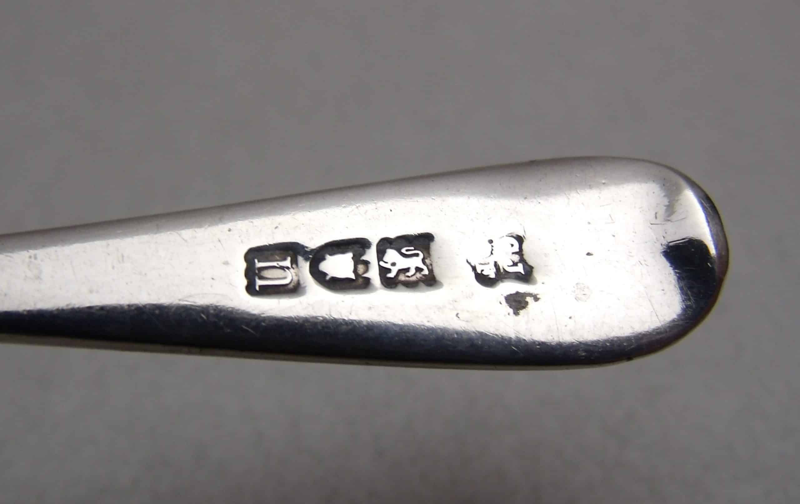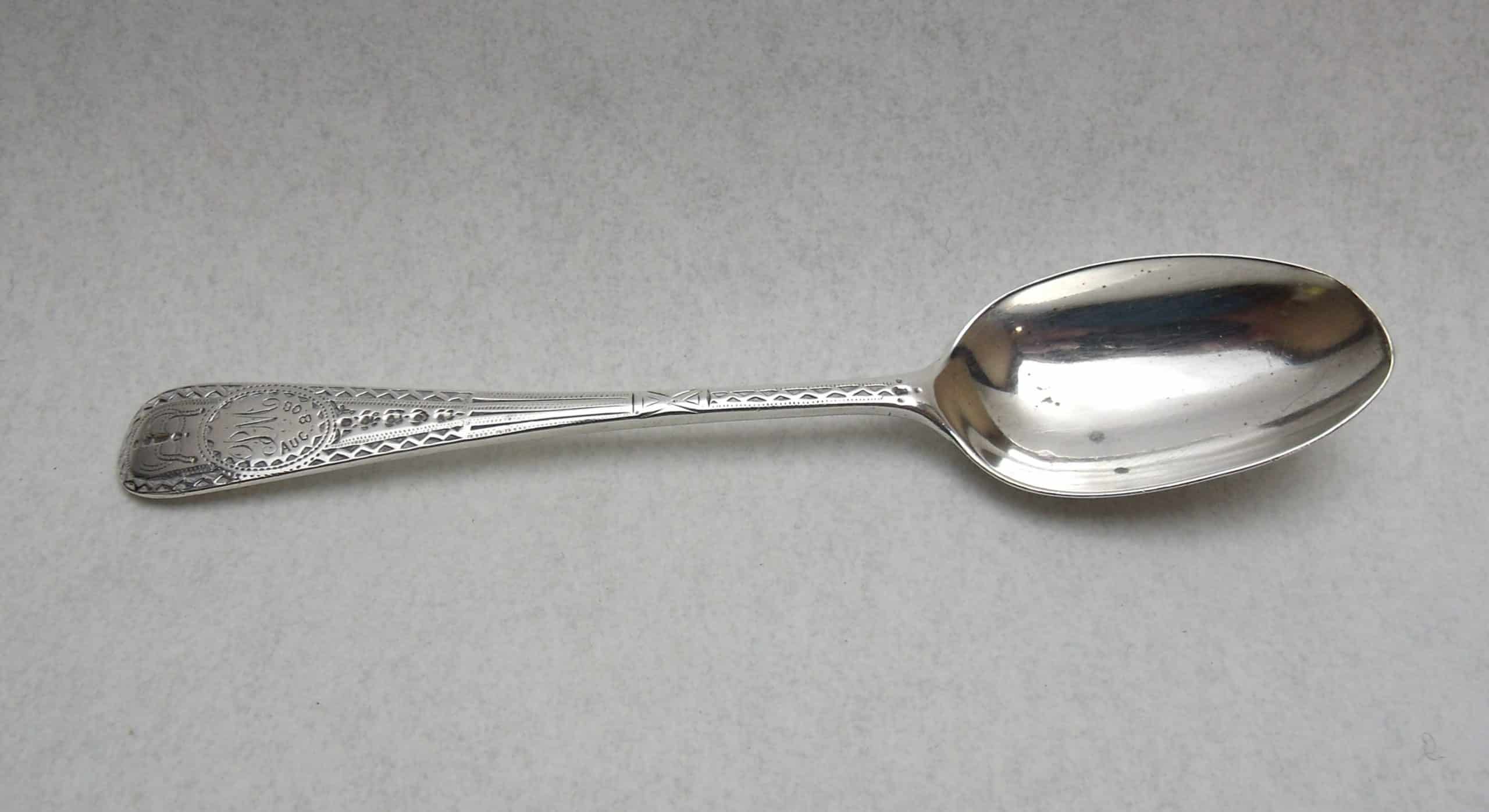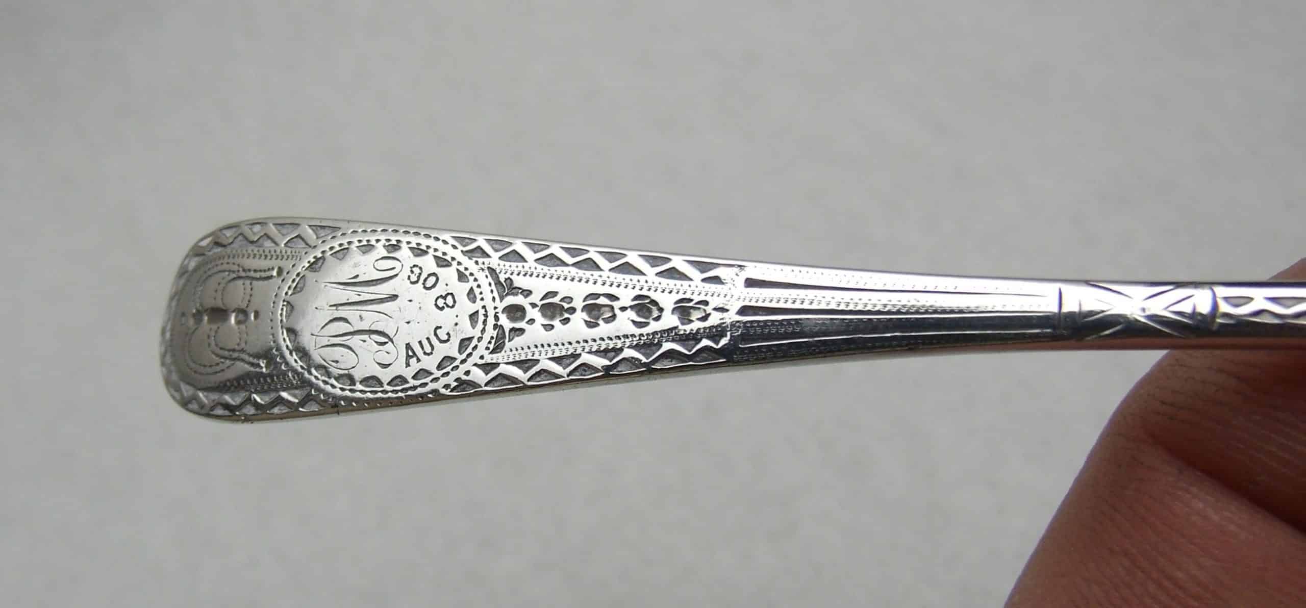 Silver Teaspoon hallmarked for 1908/09 with bright cut decoration to the handle and a cartouche engraved with the initials ‘PM’ and the date’ AUG.8.09′ There is slight wear to the tip of the bowl of the spoon. The spoon weighs 14.1g and measures 12cm by 2.5cm. It is hallmarked in London with a makers mark for Josiah Williams & Co.