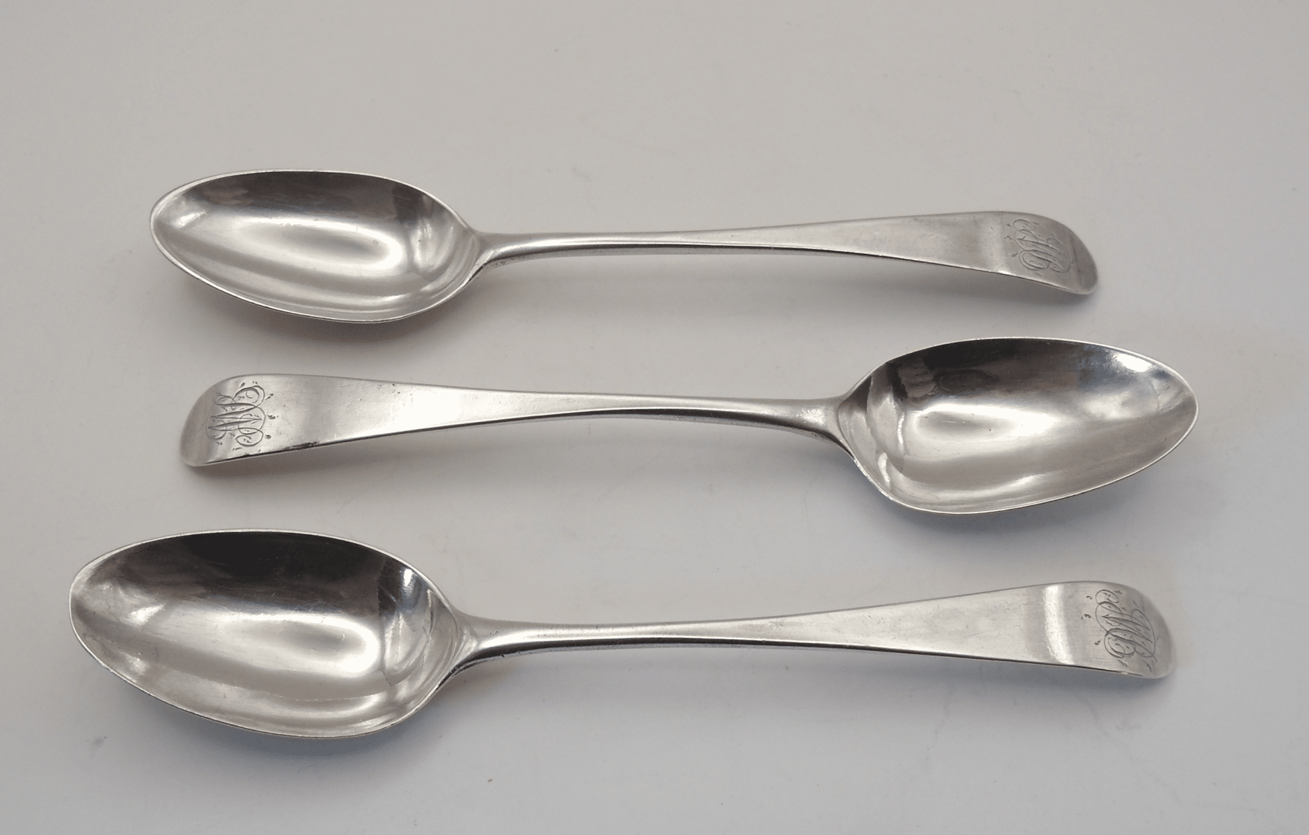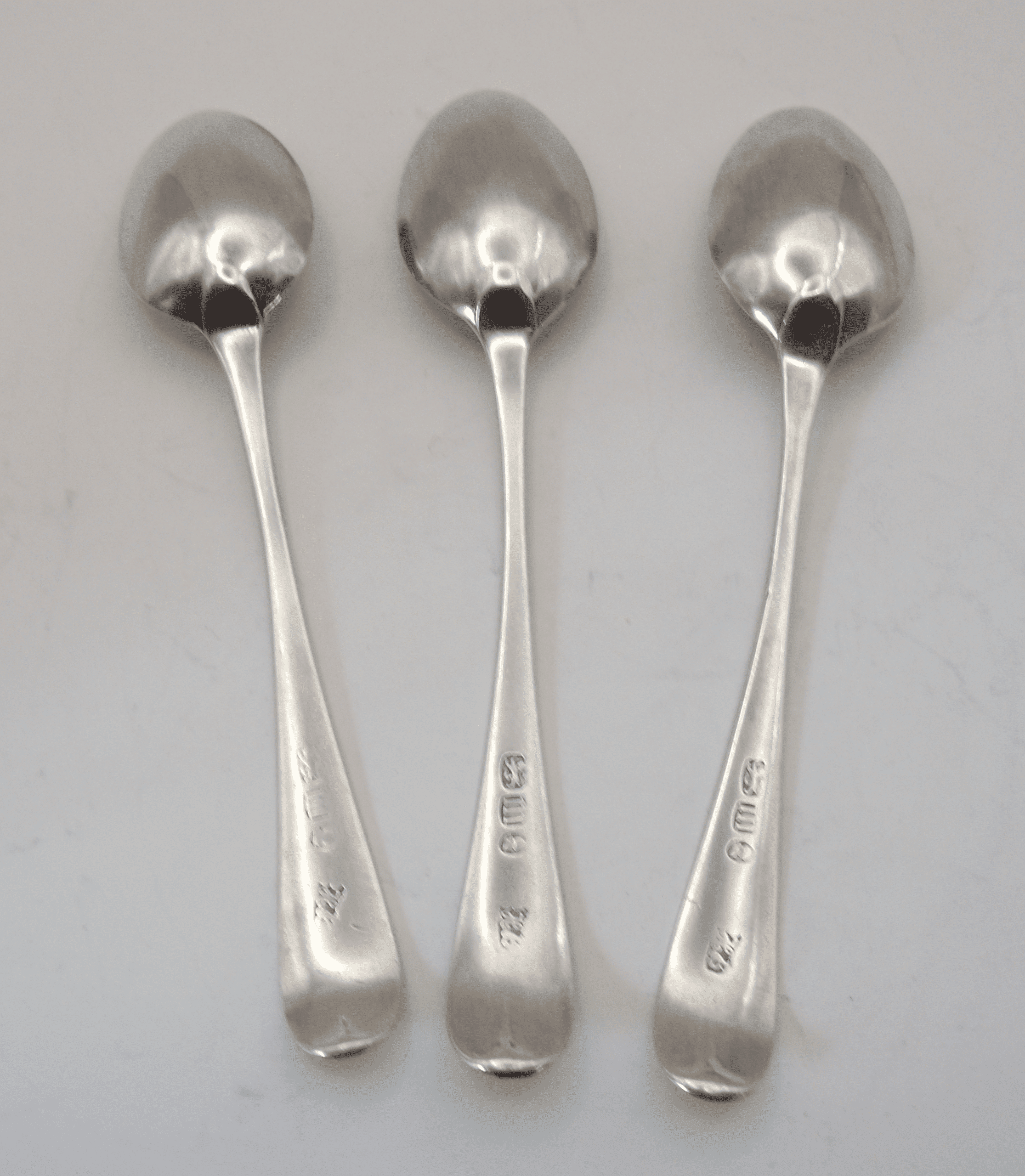 Set of three sterling silver teaspoons by Hester Bateman, London 1787. The spoons are in very good condition โ the front edge of one bowl s slightly worn but the bowls donโt appear to have been reworked, monogram to handles. The spoons measure 13 cm by 2.6cm each and weigh a combined 43.3g