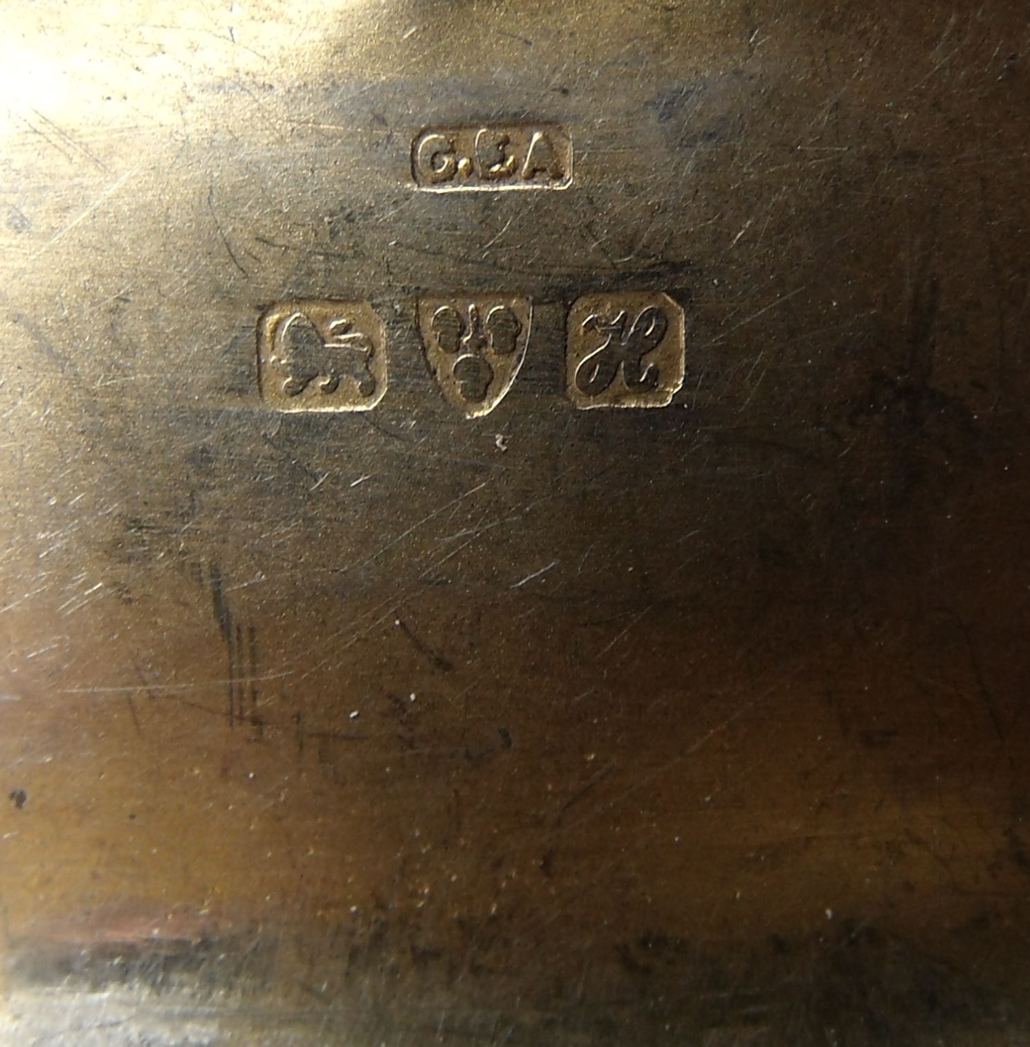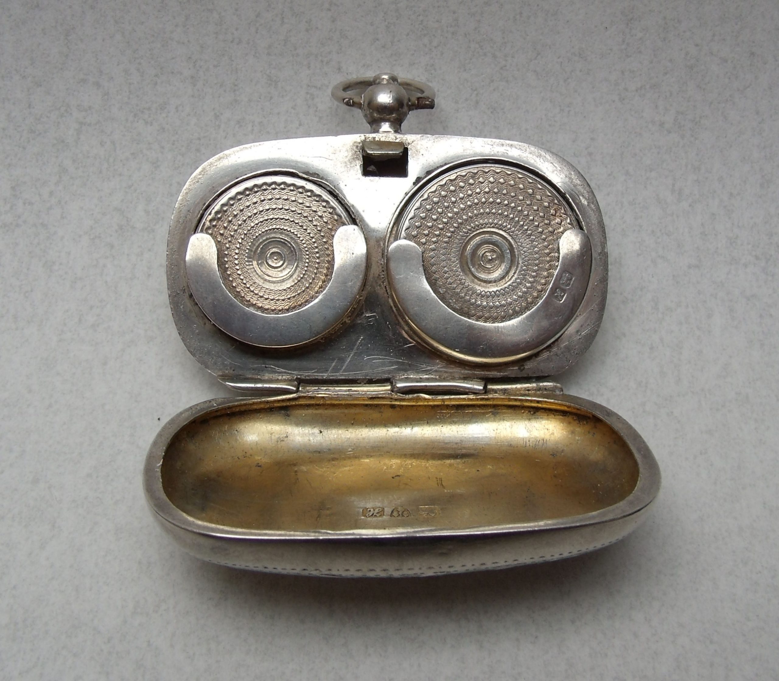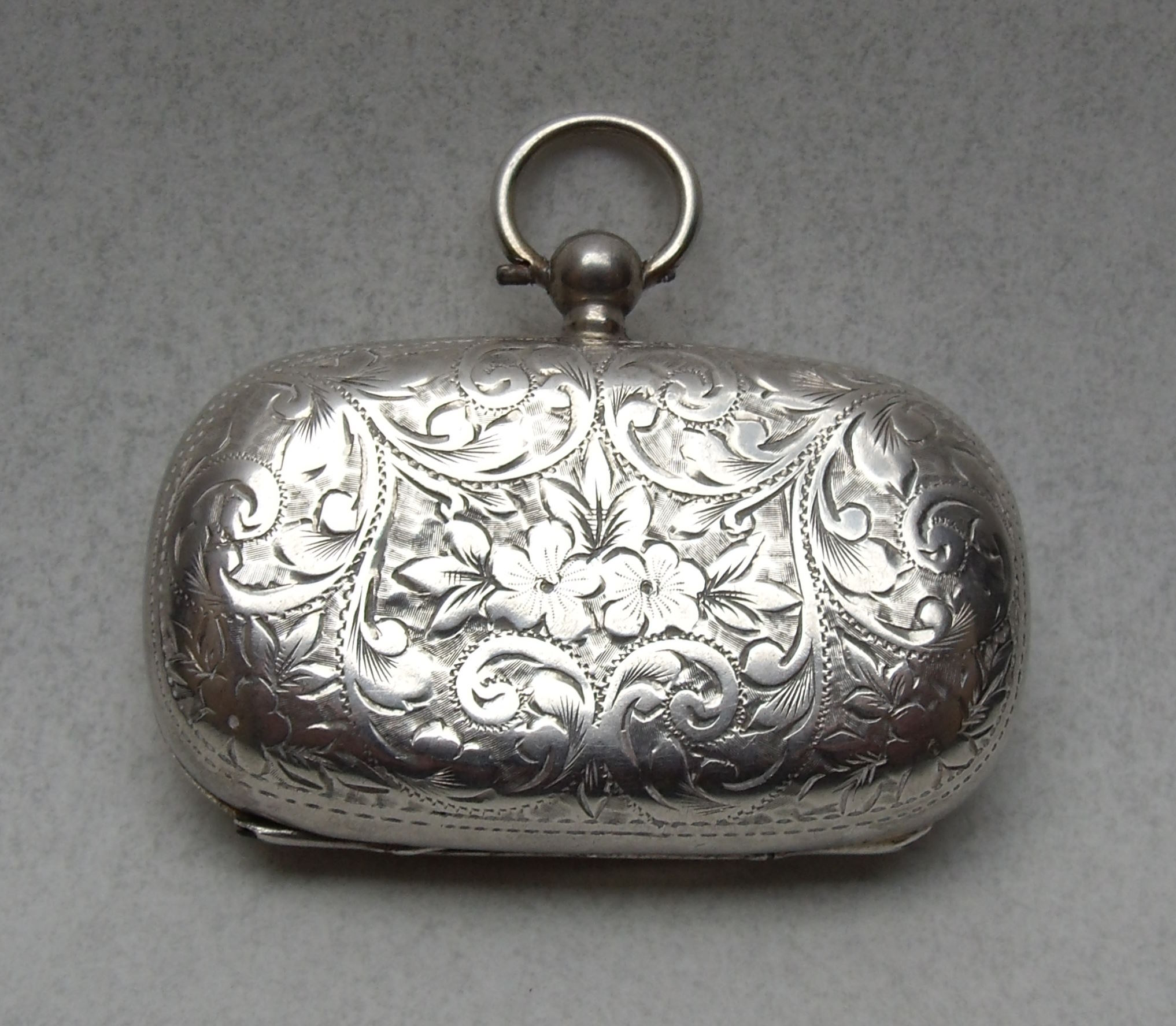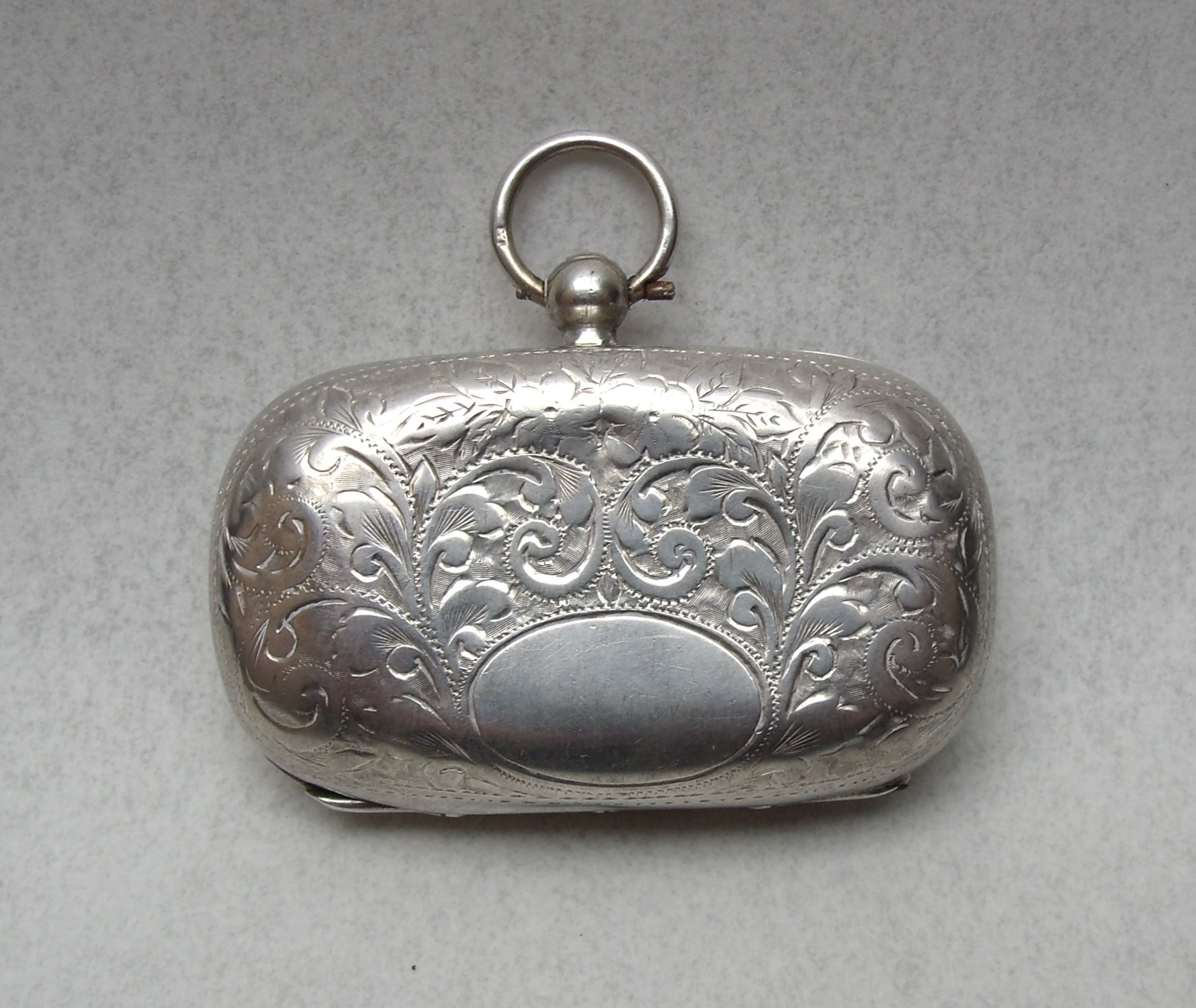 Edwardian Silver Double Sovereign Case HM Chester 1908 – An Edward the VII soverign case with chased foliate decoration with blank cartouche to upper cover, bail to top edge which operates the catch, hallmarks for Charles Edward Adams, Chester 1908 inside upper cover and inside of upper cover with gilt was, sprung compartment for full and half sovereigns, catch and hinge working. CAse measures 5cm by 3cm by 1.3 cm and weighs 33.5g.