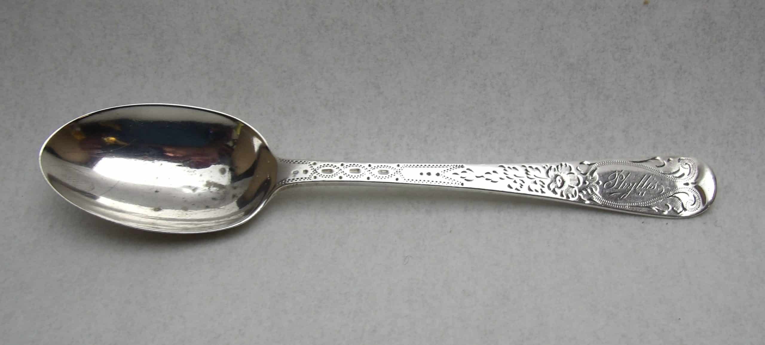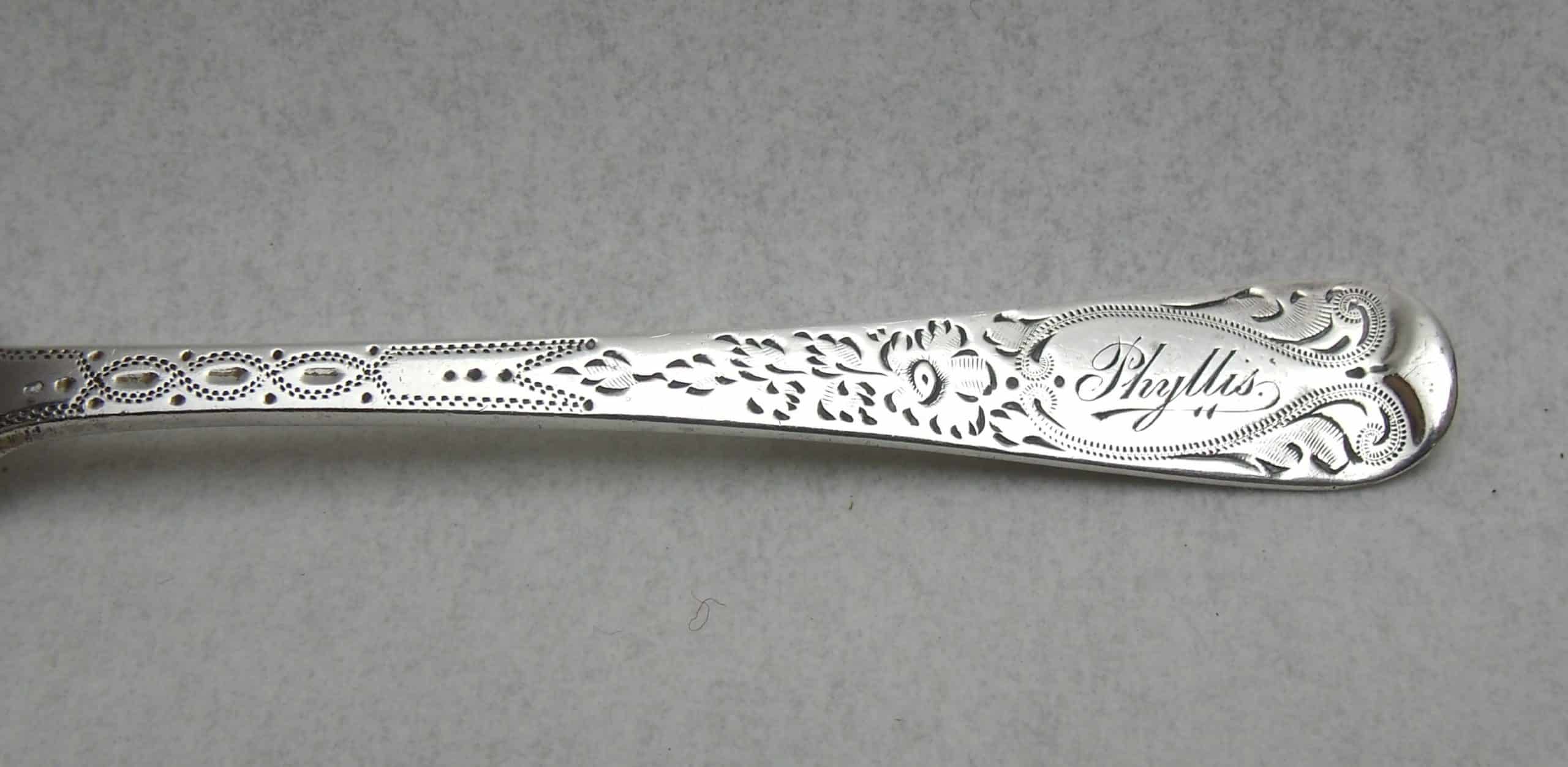 Edwardian Silver Teaspoon with bright cut decoration to front and back, cartouche on handle with the ‘Phyllis’ engraved in it. The spoon measures 14.5cm x 3cm and weighs 23.1g.