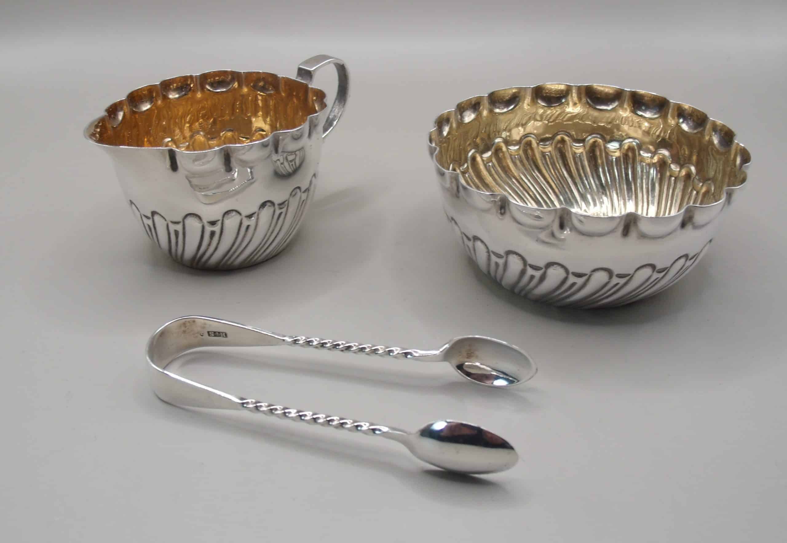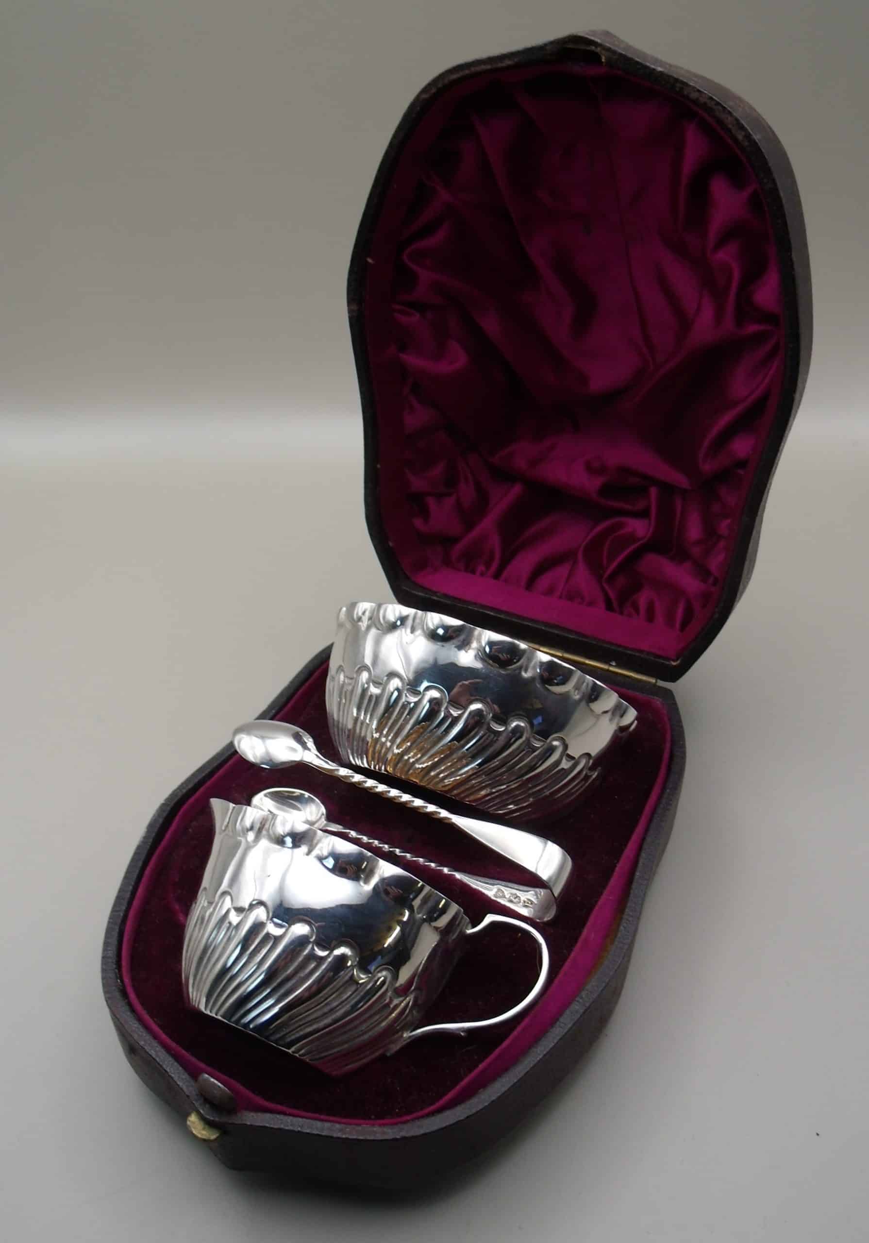 A Victorian Sterling Silver cased three piece tea service comprising a sugar bowl, sugar tongs and milk jug. All three pieces are marked for the Sheffield silversmith Henry Stratford with date letters for 1890.