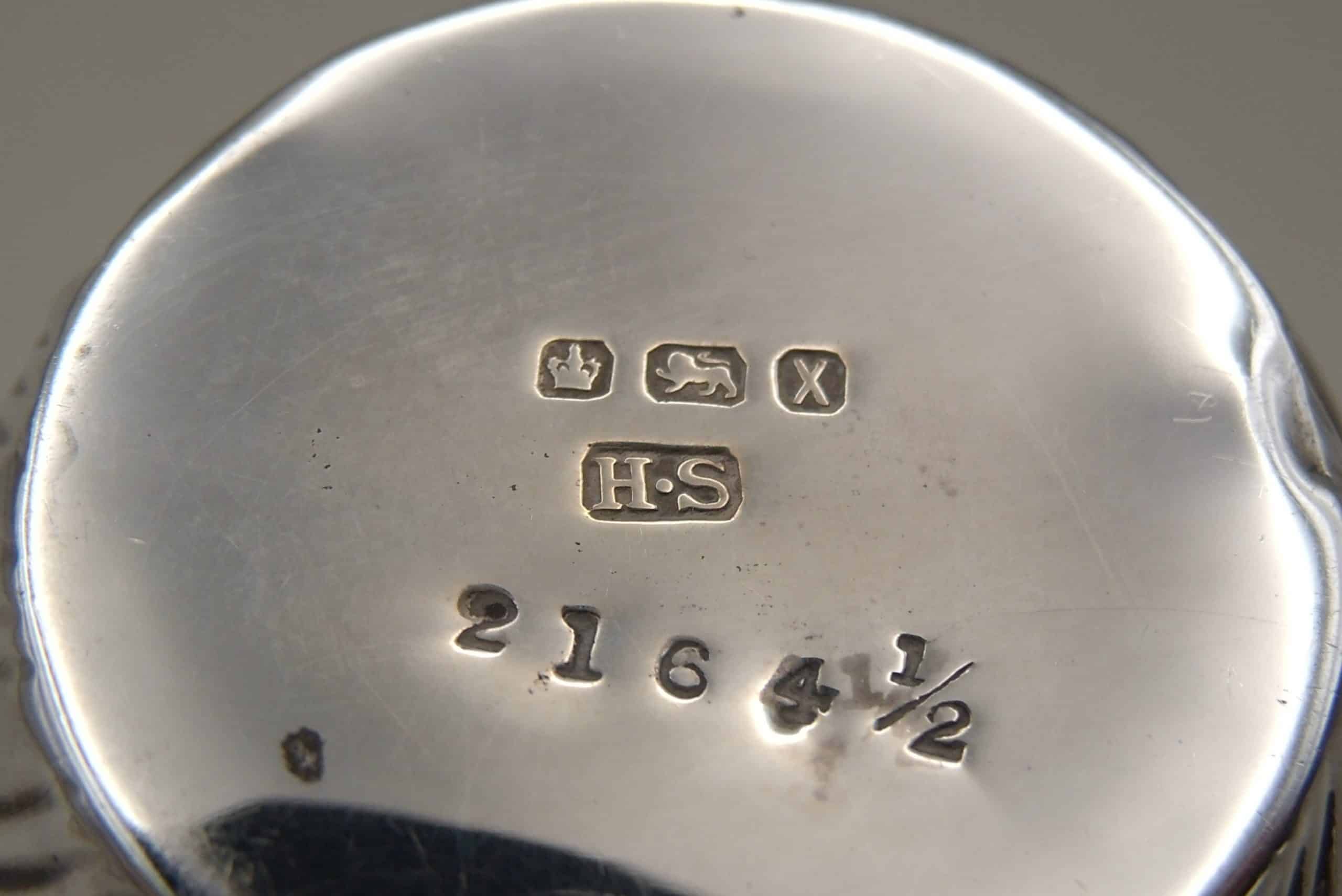 The sugar bowl measures 7.5cm by 3.5cm and weighs 38.05g and has a gilt interiorThe Jug measures 8cm from the tip of the spout to the back of the handle and is 4cm deep. Weighing 32.8g this to has a gilt interior.The tongs are 8cm long and 2.5cm across the bowls. They weigh 9.6g The set is in its original fitted case which is a bit scuffed in places but which has kept the contents in very good condition.